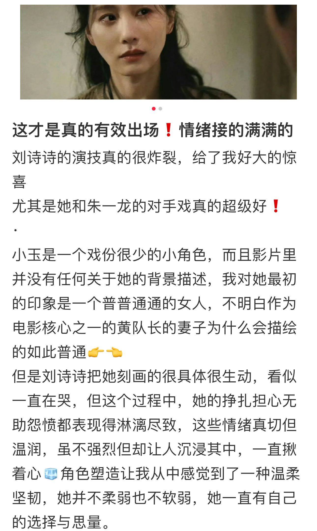 短短几分钟出场,刘诗诗做到了场场有效、帧帧有戏。从沉默凝望的眼神,到克制倾诉的语气,再到认清真相后的决绝,每一个状态都层次分明。即便戏份不多、台词有限,她仍用细腻表演填补了角色的空白,让小玉成为全片最让人共情的角色。这份“以少胜多”的表演功力,恰恰证明了真正的好演员,从不在乎戏份长短,只在乎角色是否立得住、是否能走进观众心里。